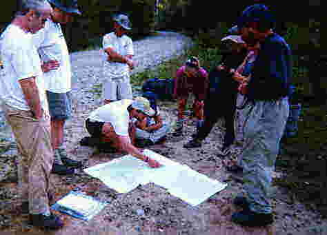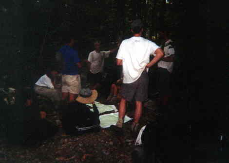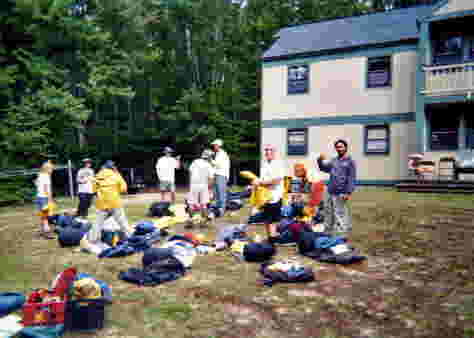 次はダッフルシャッフルだったが、これは実に時間をかけてじっくりやった。靴下から下着まで、不都合な場合やない場合は、すべてセンターから貸し出される。食料は、8日分が全部用意されて、何番の袋に何が入ったかメンバーによってチェックされながら食料バックに詰められていった。自分は、食料バックを2つ持ったが、腹が立つくらい重たくて分厚い寝袋と合わせて、「なんじゃこりゃあ。」と思うくらいの重たいザックになった。 参加者たちの顔を見ても、特に女の子たちは「こんなはずじゃあなかったわ。」と思っている様子がありありと分かる。900ドル(10万円)の大金を払って余暇を楽しみに来た人たちで、これからどういう展開になるのか楽しみでもある。