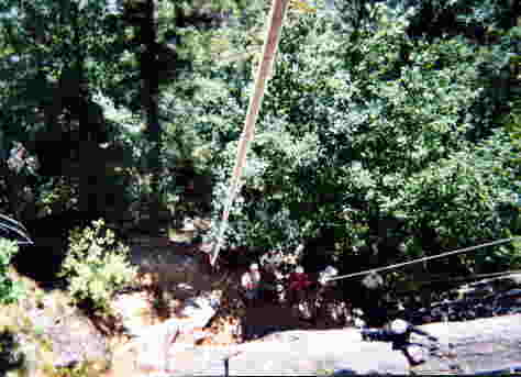 コース4日目。山から稜線を反対側に降りて、昼過ぎにワイルドリバーと言う川の縁に着いた。今日はサービスの日で、すなわち奉仕活動の日である。用意されていたスコップやつるはしや人の背ほどもあるノコギリを手にして、河原のトレールの修復に向かう。一抱え以上もある大木がトレールに倒れかかっており、これを根元から切り落として大木をトレールから取り除くことが私に課せられたサービスとなった。下手にノコギリを持つんじゃなかったという後悔がよぎるほど大木は歯が立たず、両腕は根元からぱんぱんで感覚が無くなった。リチャードの加勢で何とか大木は取り除かれて、後には言いようのない充実感と満足感が残った。 |