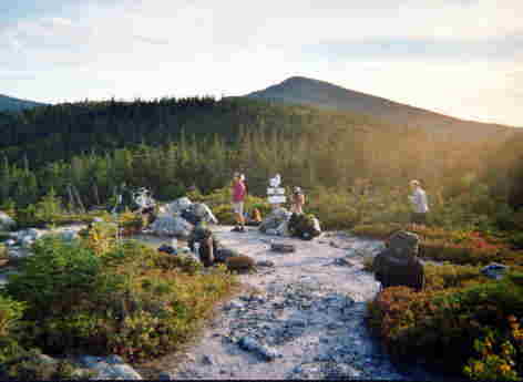 一度道に迷ったが、夕刻前のいい時間に今日の目的地(イーグルグレッグ)まで到着した。いきなりアルベルトが、「タツ!サイトを探しに行こう!」と、林の中に入っていく。「おっ!なんか変な雰囲気だぞ。」とワクワクしながら「どうしたんだアルベルト。」と聞いたら、「あいつら動こうともしない。いつもおれたちがやらなきゃいけないんだ。」と、不満いっぱいである。アルベルトは今まで一番張り切って荷物も一番多く持っていたが、疲れもピークに達して爆発したようである。大人のコースも子供と同じだ。感情の変化の過程はそんなに変わらない。 |