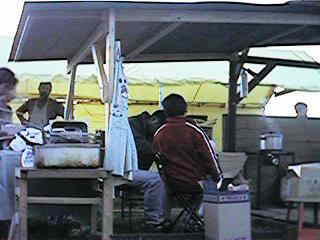 今日は朝から大忙しだ。ブースの奥で私が椎茸をスライスし、奥さんが中で天ぷらの衣をつけ、トシが揚げて店に出す。勘定は子供のノリ君の仕事だ。椎茸はアメリカでも健康食品として脚光を浴びていて、なかなかの繁盛ぶりだ。わざわざブースの奥の私の仕事場にまで出向いてきてあれこれ質問してくる人もいる。たのむから話しかけないで… |