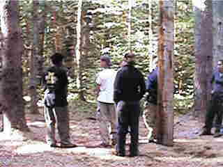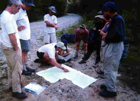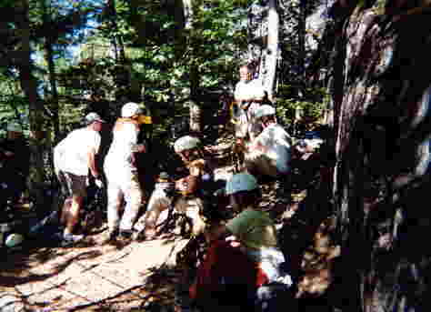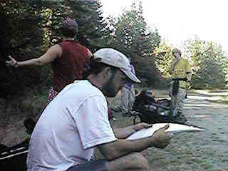 pm1:15分に出発し、トレールを通ってバックパッキングが始まった。子供たちの足取りは軽く、20分毎にバックを担いだままの休憩を取っている。じっくり1時間歩いて、バックを降ろしての休憩が始まったが、何と50分間の休憩で、だんだん様子が怪しくなってきた。出発しても、荷物の重い子供が不平を漏らすようになり、グループも離れだした。30分歩いて30分休憩。そして15分歩いて15分休憩。次に15分歩いた後にはもうグループは動かなくなっていた。地図読みを間違って、自分たちは随分先に進んでいるつもりらしい。が、マイクはここでもじっとがまんしていた。2日前にトレーニングフレーズ(カヌーのプログラム)が終わり、今はメインフレーズだから、子供に任すのだという。今日の遅れを取り戻すスキルがあるからこそできるのだろう。その日は5マイル(7〜8km)歩いてキャンプとなった。 |