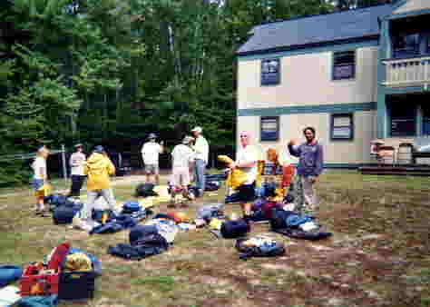 次はダッフルシャッフルだったが、これは実に時間をかけてじっくりやった。靴下から下着まで、不都合な場合やない場合は、すべてセンターから貸し出される。食料は、8日分が全部用意されて、何番の袋に何が入ったかメンバーによってチェックされながら食料バックに詰められていった。自分は、食料バックを2つ持ったが、腹が立つくらい重たくて分厚い寝袋と合わせて、「なんじゃこりゃあ。」と思うくらいの重たいザックになった。 参加者たちの顔を見ても、特に女の子たちは「こんなはずじゃあなかったわ。」と思っている様子がありありと分かる。900ドル(10万円)の大金を払って余暇を楽しみに来た人たちで、これからどういう展開になるのか楽しみでもある。
