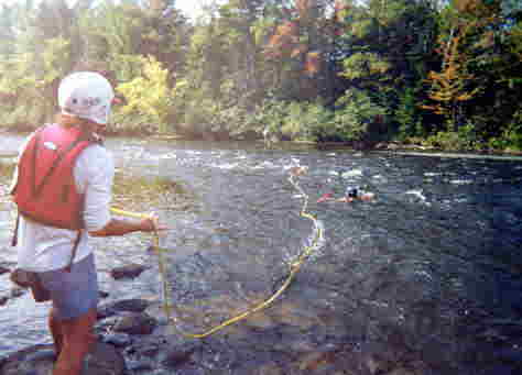 | まずは、パドリングの復習から始まって(私にとっては最初の講習だったが…)、実際に、急流を下り、岩を巻く水の流れを利用して岩の内側に入る「エディターン」を練習した。次は、沈したときの練習で、上流からずぶずぶ水の中に入って、「あれー。」というかけ声と共に急流に飛び込んで、自力でエディターンをする訓練だった。上半身裸でライフジャケットを身につけて飛び込んだら、息を止めるくらい水は冷たく、さらに片手に持ったパドルが自由を奪ってどんどん下流に流されていく、先に飛び込んだ大学生が、「ちくしょう。ちくしょう。」と叫びながら岸に泳ぎ着いた気持ちがよく分かる。とにかく、足を下流に向けて水面に浮かせて、岩場をやり過ごし、岩を巻く水に乗るべく死にものぐるいで水をかいた。「グッドジョブ!」みんなでお互いの健闘をたたえ合う。 |