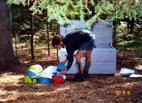 森の中にあるハイロープコースのギアボックスです。この中に、常時12人分のギアが入っています。ギアのチェックはその場のインストラクターが行います。ギアボックスの中には救急セットも入っていて、ケガをしたときにも対応ができるようになっています。そのグループのイントラが、責任を持って管理、設営、チェック、撤収を行います。 |