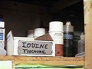 アイダインを英語で書くと、IODINE と綴るのです。ちょっとよく見て!ローマ字読みでちょっと無理して、「イソジン」と読めませんか。そうなのです?これは、日本でうがい薬に使われているヨウ素液なのです。私のつたない英語力で成分表を読んだら、エチルアルコール割りの5%ヨウ素溶剤と書いてあったように思えます。コ○ゲンのうがい薬で代用できるかどうかはちょっと分かりません。 |