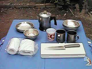 お皿は給食用のセットを手に入れて使っています。熱くなりますが、手入れが楽なので気に入っています。この中で一番大切なものは、トイレットペーパーです。上手に使うと、洗剤で食器を洗う必要がなくなります。