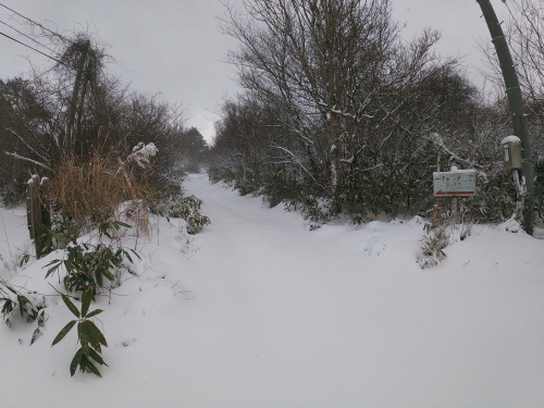 | 9:02 林道から登山道への分岐です 新しい雪が積もっています |