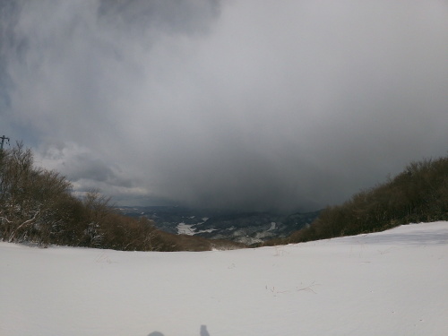 | 10:45 ここラピュタゲレンデで休憩する予定でしたが 北側から雪雲が接近していました ぐずぐずしていると雪に覆われてしまいそうです 下山です |