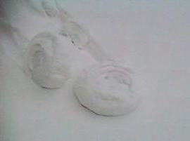 コース側の崖を転がり落ちた雪が、まるでバームクーヘンのように丸まっていました。